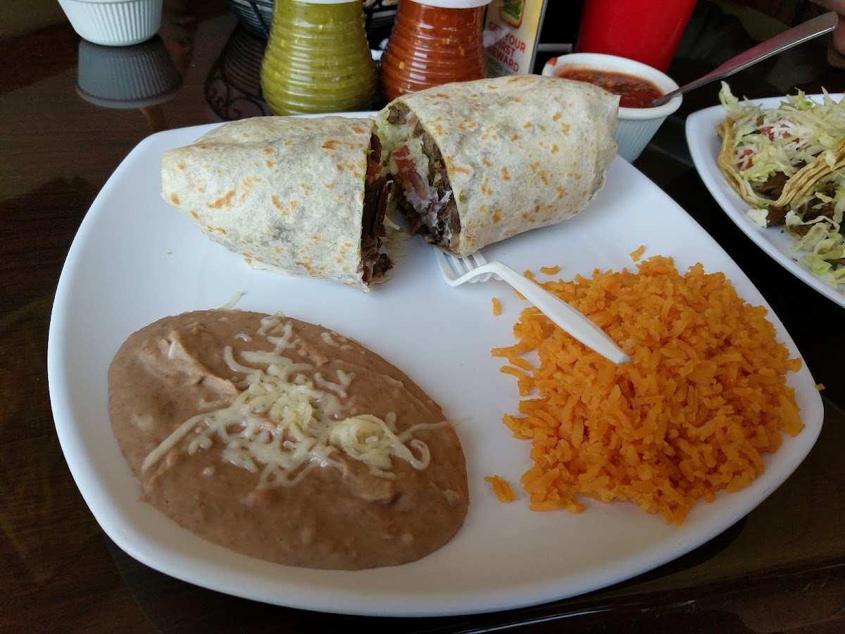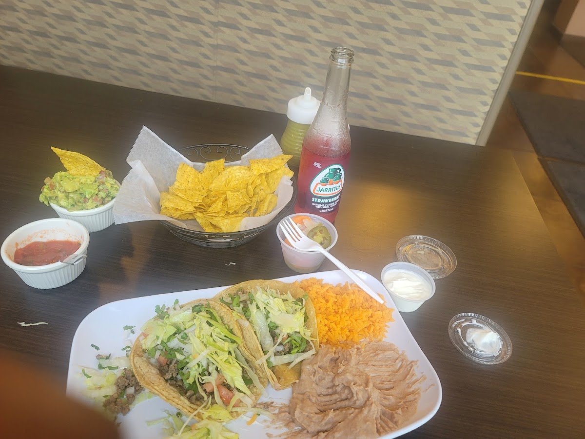 Mixed Taco Dinner One Shrimp One Language and One Steak Taco with Rice and Beans